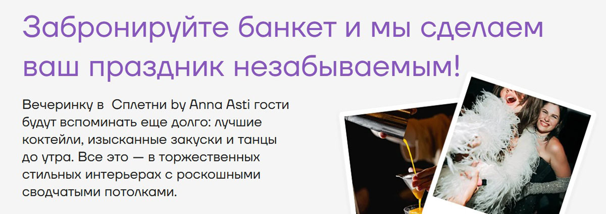 Фейерверки игристого, жаркие танцы от самых модных диджеев, праздничная программа от арт-группы, яркие шоу-моменты, поздравление от идейной вдохновительницы бара Anna Asti и отдельный караоке-зал с ведущим и бэк-вокалом, где каждый тост звучит как начало новой истории.